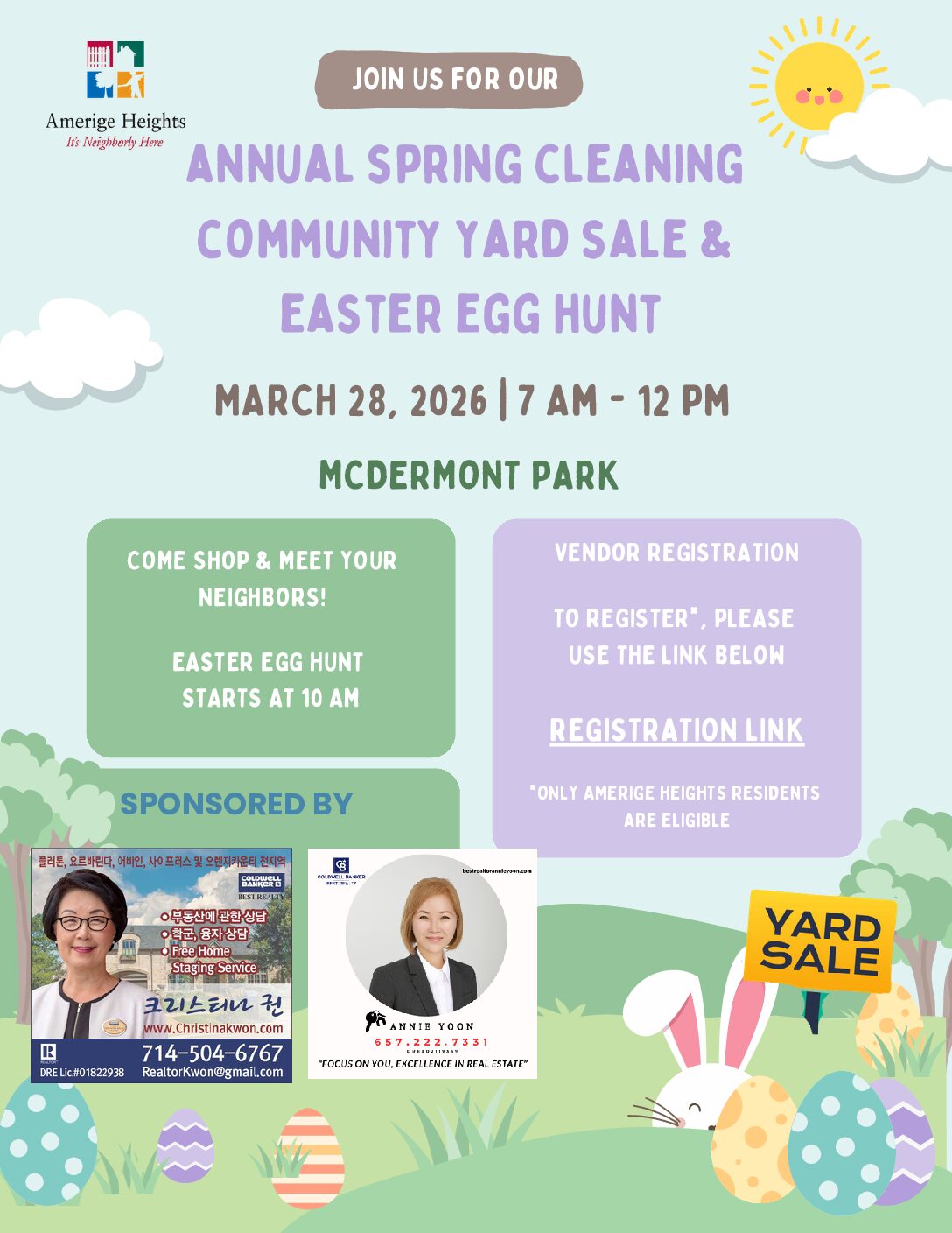 We wanted to send a reminder to invite you to the Amerige Heights Community “Spring Cleaning” Yard Sale & Easter Egg Hunt!